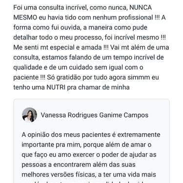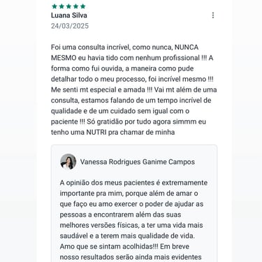 Anos depois, escolhi a Nutrição como propósito de vida: transformar essa experiência em acolhimento real. Desde então, venho ajudando pacientes não só a emagrecer, mas a aliviar sintomas antigos, muitas vezes ignorados por falta de escuta, empatia ou uma anamnese bem feita.